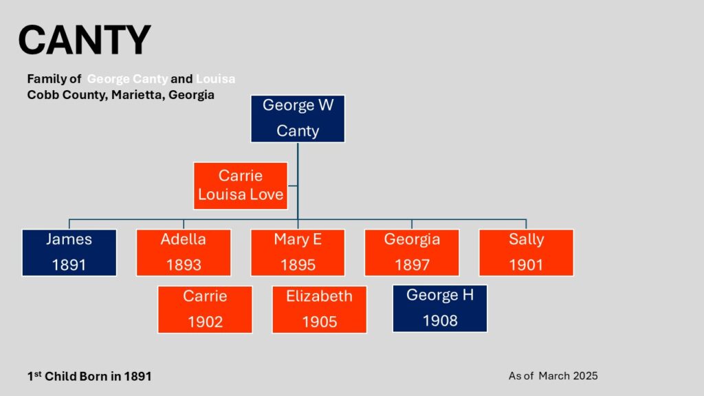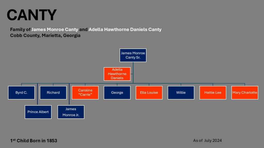 Family Charts Include: Family of James Monroe Canty and Adella Hawthorne Daniels Canty Family of James Jr Family of Byrd Family of Prince Family of George Family of Richard Family of Will